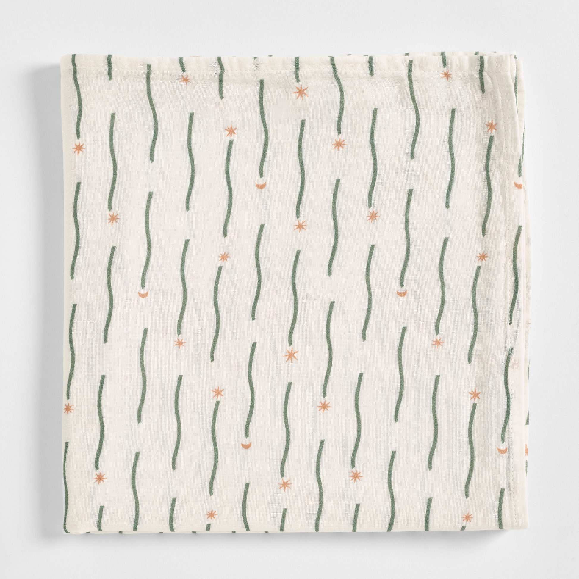 Our Night Sky muslin swaddle blanket is crafted from 100% certified organic cotton, gentle on delicate skin and free from harmful chemicals. Versatile everyday essential - Perfect not just for swaddling, but as a pram cover, nursing cover or comfort blanket.